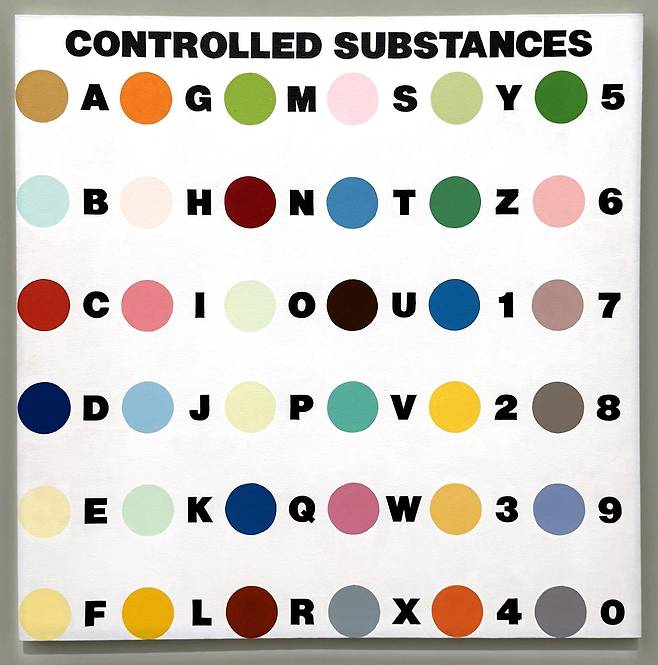 데이미언 허스트의 ‘규제 물질 단서 페인팅’(1994년·사진)은 바로 이 지점을 시각화한다. 흰 캔버스 위에 일정한 간격으로 배열된 색점들은 얼핏 단순한 추상 회화 같지만, 각각은 실제 약물 이름과 연결된 기호다. 제목의 ‘규제 물질’은 일반인의 접근이 제한된 약물을 뜻한다. 작품은 회화라기보다 현대 약물 체계의 서늘한 도식에 가깝다.
