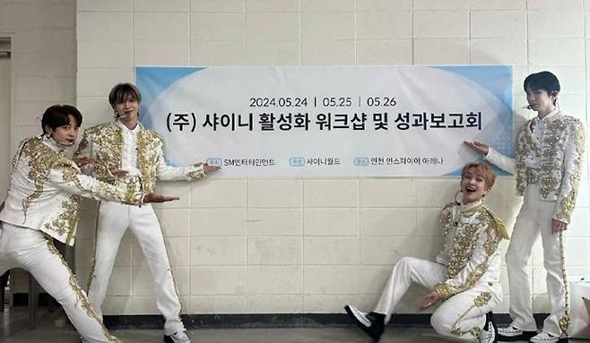 공개된 사진 속 샤이니 멤버 온유, 키, 민호, 태민은 하얀색에 금장 장식이 달린 화려한 무대 의상을 차려 입은 채 카메라를 향해 환하게 미소 짓고 있다. 특히 5개월 만에 모습을 드러낸 멤버 키는 다소 창백한 얼굴에 어색한 미소를 지어 눈길을 끌었다.