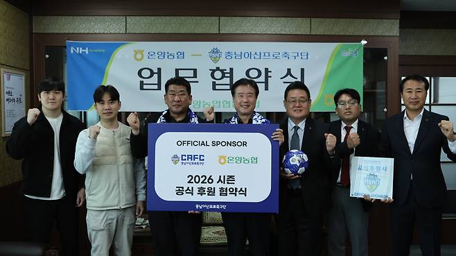 충남아산과 온양농협은 지난달 27일 충남 아산 소재 온양농협에서 2026시즌 후원 협약식을 진행했다. 이날 협약식에는 박명화 충남아산 사무국장, 백성현 온양농협 조합장을 비롯한 양사 관계자들이 참석했다.