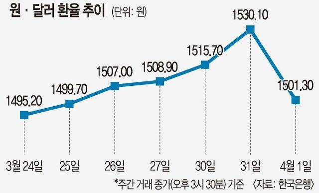 이날 서울 외환시장에서 원·달러 환율 주간 거래 종가는 전 거래일보다 28.8원 내린 1501.3원을 기록했다. 미국과 이란 사이에 종전 기대가 커지면서 위험회피 심리가 다소 진정된 영향이다. 이날부터 한국 국채가 세계국채지수(WGBI)에 편입된 점도 원화 강세 요인으로 작용했다.