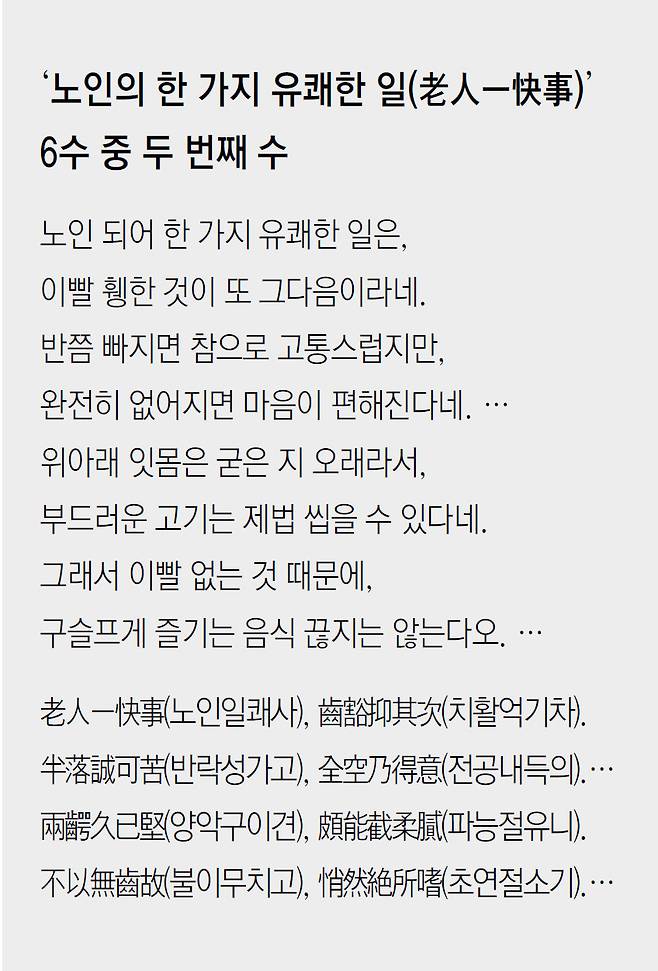 시인이 든 여섯 가지 즐거운 일은 탈모, 낙치, 시력과 청력의 약화같이 사람을 서글프게 만드는 노화의 징표들이었다.