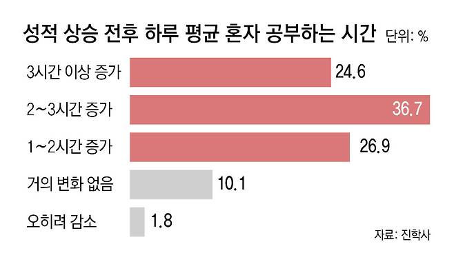 사교육에 대한 인식도 바뀌었다. 성적이 오르기 전에는 ‘사교육이 자기 학습을 대체했다’(25%), ‘사교육 때문에 자기 학습 감소’(23.7%) 등의 응답이 많았다. 하지만 성적이 오른 뒤에는 ‘사교육이 보조 역할을 했다’(38.9%)는 응답이 크게 늘었다. 사교육을 받은 뒤에 복습을 하지 않았다는 응답도 성적이 오르기 전에는 40.8%에 달했으나 성적이 오른 뒤에는 6.2%로 낮아졌다. 그 대신 자주 복습(41.9%), 가끔 복습(24.6%) 등이 많아졌다.
