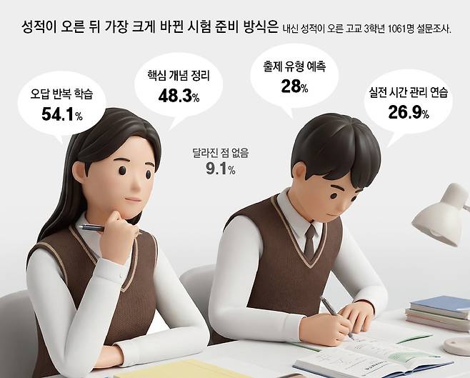 우연철 진학사 입시전략연구소장은 “고교 시절 내신 성적이 크게 오른 학생들 대부분은 공부하는 방식을 바꾼 것으로 보인다”며 “틀린 문제를 그냥 지나치지 않고 다시 풀어보고 원리를 깨치려는 학생들의 성적이 올랐다. 핵심 개념 정리, 실전 시간 관리 등도 중요했다”고 전했다.