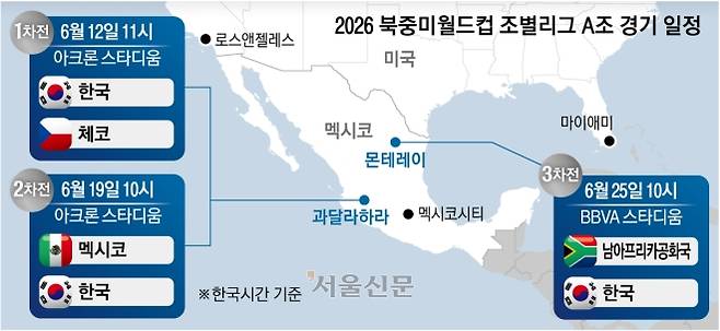 한편 체코가 이날 승부차기 끝에 유럽축구연맹(UEFA) 플레이오프(PO) D조 결승에서 덴마크를 꺾고 본선에 진출하면서 대표팀의 조별리그 1차전 상대로 확정됐다. 한국과 체코는 6월 12일 멕시코 과달라하라 아크론 스타디움에서 조별리그 A조 1차전을 치른다.