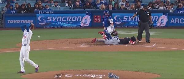 이날 오타니의 활약보다 경기 중 발생한 사구 장면이 현지에서 더 큰 화제를 모았다. 오타니는 1-0으로 앞선 5회 말 2사에서 앙헬 마르티네스를 상대로 던진 시속 96.4마일(약 155.1km) 패스트볼을 무릎 부근에 맞혔다. 마르티네스가 극심한 통증을 호소하며 그라운드에 쓰러지자, 오타니는 하늘을 바라보며 머리를 감싸 쥐는 등 강한 자책감을 드러냈다.