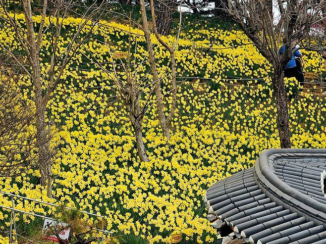 천천히 가옥 뒤편으로 발걸음을 옮기자 드넓은 수선화 군락이 펼쳐졌다. 약 3만3000㎡ 규모에 달한다고 한다. 유기방가옥의 수선화 축제인 2026 수선화풍경은 3월 27일부터 4월 19일까지 이어지는데, 넓은 규모로 인해 일조량에 따라 구역별 개화 시기가 달라 비교적 긴 기간 동안 수선화를 감상할 수 있다.