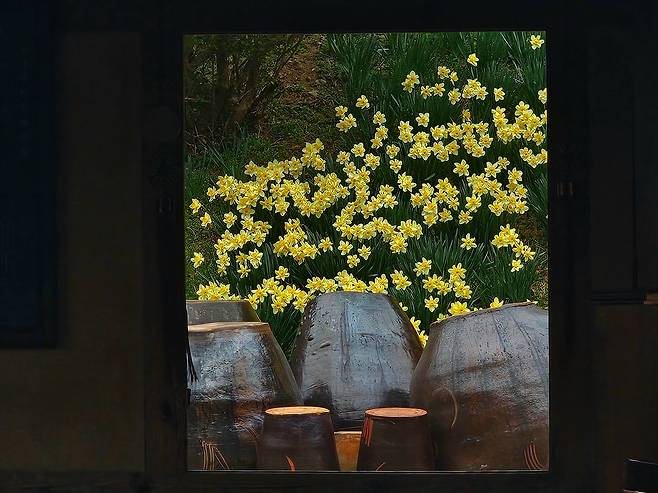 | ▲ 안채와 사랑채 창 사이로 보이는 수선화는 한편의 그림을 떠올리게 한다 |