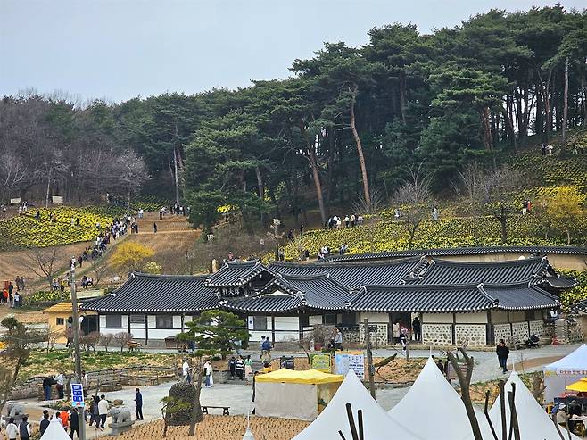 약 20분 정도 기다려 차를 주차하고 걷기 시작하자 그 이유를 알 수 있었다. 조그마한 한옥 뒤로 노란 물결이 넘실거리고 있었다. 저 멀리 전통 가옥과 그 주변을 채운 수선화가 어우러지며 어디에서도 쉽게 볼 수 없는 풍경을 만들고 있었다.