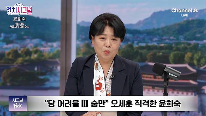 윤희숙 국민의힘 서울시장 예비후보가 오세훈 현 시장을 "굉장히 기회주의적"이라고 비판했습니다.
