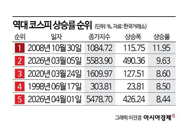 상승과 하락폭도 매우 컸다. 전날 코스피는 전거래일 대비 426.24포인트 급등했는데 지수 상승폭만 놓고 보면 우리 증시 역사상 두번째로 컸다. 역대 코스피 상승폭 1위는 지난달 5일 기록한 490.36포인트다. 당시 미국과 이스라엘의 이란 공습 직후 코스피가 폭락한 뒤 이튿날 저가 매수세가 유입되며 증시가 급등했다. 우리 증시 상승폭 1위와 2위가 모두 트럼프와 미국의 대이란 전쟁에서 비롯된 셈이다.