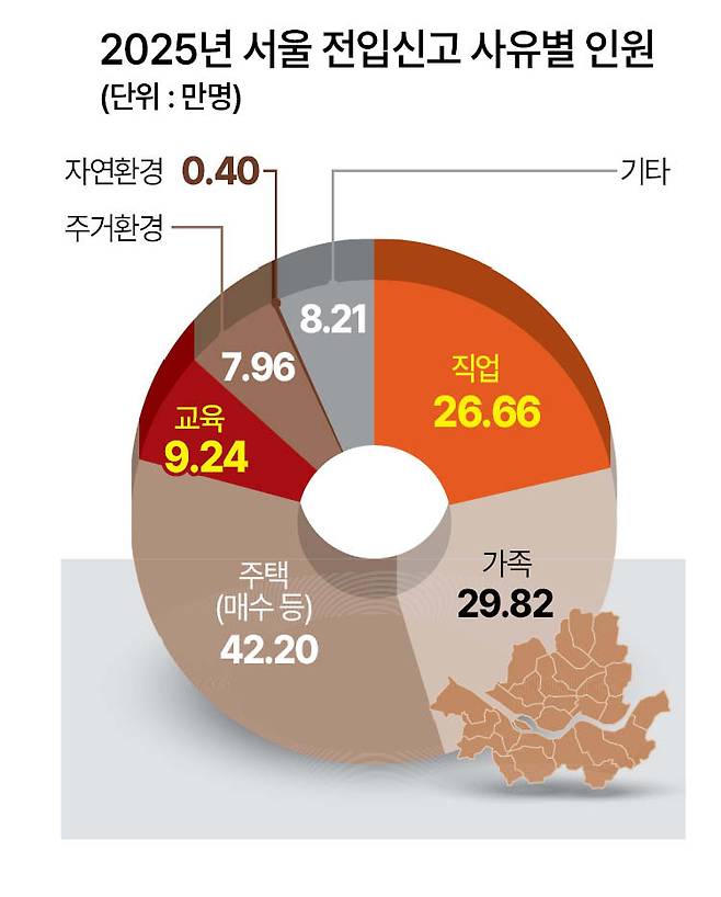 국가데이터처에 따르면 지난 2025년 한 해동안 서울에서 전입신고를 한 이동자 수는 총 124만4928명으로, 이 중 약 36만 명이 대통령이 언급한 직장이나 자녀 교육 문제로 거주지를 이동한 것으로 나타났다. 이는 주민등록 전입신고서를 대상으로 이뤄진 조사로, 현행법상 거주지(비아파트 포함) 이동자 중 행정구역 경계를 벗어난 이는 의무적으로 전입신고서를 제출하고 있다.