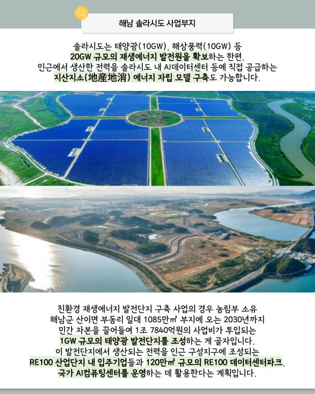 솔라시도는 AI 인프라뿐 아니라 태양광·해상풍력 기반의 대규모 재생에너지 단지와 RE100 산업단지, 데이터센터 파크 조성도 병행한다.