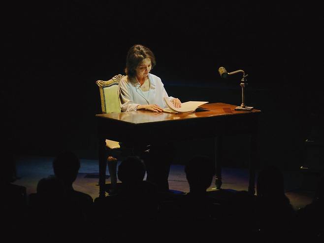 각 장면은 시와 음악이 맞물리며 선명한 이미지로 살아난다. 소복이 쌓이는 눈과 외로이 켜진 호롱불의 대비가 돋보이는 ‘설야(雪夜)’에 드뷔시 ‘눈 위의 발자국’이 흘러나왔다. 서재처럼 꾸며진 무대 한가운데 김 배우가 직접 앉아 낭송하자, 눈 내리는 밤의 고요와 쓸쓸함이 손에 닿을 듯 깊이 다가왔다.
