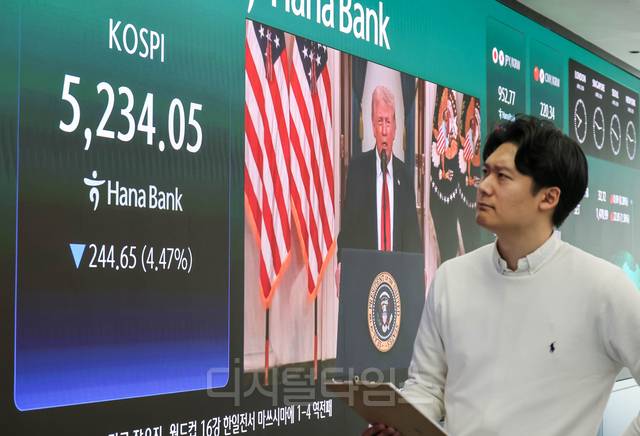 도널드 트럼프 미국 대통령이 대국민 연설에서 이란 전쟁에 대한 강경한 입장을 표명해 시장 기대가 꺾이면서 코스피가 전 거래일보다 244.65포인트 하락한 5234.05로 장을 마친 2일 서울 중구 하나은행 딜링룸에 증시 현황이 나오고 있다.