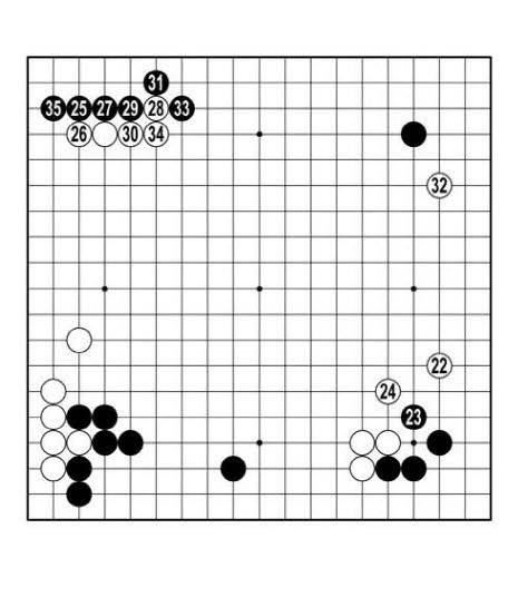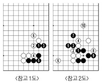 강동윤이 백22로 다가갔다. 인공지능 카타고는 <참고 1도> 흑1에 붙이고 두어도 괜찮다고 하는데 신진서는 흑23 한 수를 두고 이곳에서 손을 뺐다. <참고 2도> 흑1·3으로 끊어 이곳을 싸움터로 만들어봐야 얻을 게 없다. 백이 아래에서 또 오른쪽에서 쉽게 안정된 자세로 터를 잡는다. 백이 집도 절도 없는 수를 두는 사이에 신진서는 흑25로 귀 하나를 더 가졌다.