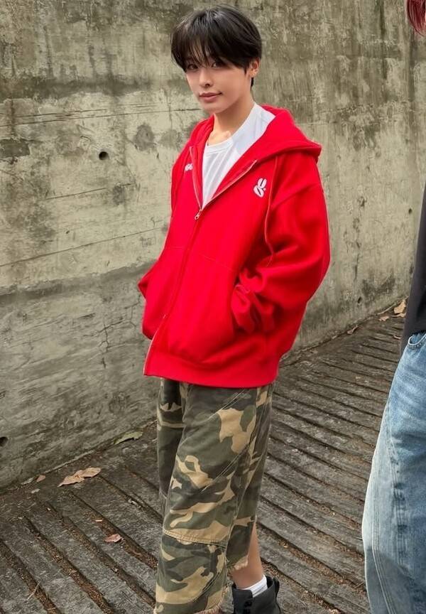 봄의 분위기에 맞춰 화사한 변화를 주고 싶다면. 칙칙하고 어두운 컬러 대신 평소 시도해보지 않았던 색감에 주목해 보자. 리쿠는 올해의 패션 트렌드인 '컬러의 해방'을 모티프 삼아 쨍한 빨간색 후드 집업을 착용했다. 자칫하면 튀어보일 수 있지만 하의에 카무플라주 패턴의 버뮤다팬츠를 더해 시선을 영리하게 분산시킨 기발한 아이디어가 돋보인다. 발목 위까지 올라오는 하이 부츠와 흰 양말로 학생 같은 풋풋한 이미지를 표현하며 NCT WISH 특유의 귀여운 포인트까지 놓치지 않았다.