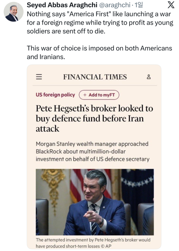한편 아바스 아라그치 외무 장관은 이날 X를 통해 피트 헤그세스 미 국방장관이 2·28 공격에 앞서 방산 펀드를 매입했다는 영국 파이낸셜 타임스의 기사를 링크한 뒤 "젊은 군인들을 사지로 보내면서 수익을 보고자 외국 정권을 향해 전쟁을 거는 것만큼 '미국 우선'을 잘 보여주는 건 없다. 이 선택의 전쟁은 미국인과 이란인 모두에게 강요되고 있다"고 비판했다.