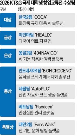 2일 서울 중림동 한국경제신문사 다산홀에서 개최된 ‘2026 KT&G 국제 대학생 창업교류전’은 올해로 26회를 맞이한 국내 최초의 대학생 창업경진대회다. 이날 한국 대학생 창업팀 외에도 인도네시아 몽골 대만 베트남 등 아시아 11개국에서 15개 팀이 참가했다. 대회 참가자만 87명에 달했다. 한국경제신문사가 주최하고 KT&G가 후원했다.