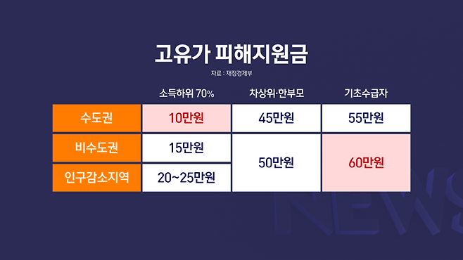 서민층의 고유가·고물가 부담을 덜어주는 취지로, 소득하위 70% 이하 국민에게 1인당 10만~60만원을 지급하는 내용입니다.