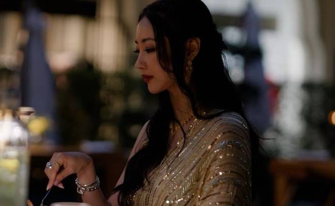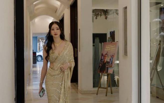 공개된 사진 속 그는 한쪽 어깨와 허리라인을 드러낸 화려한 금빛 드레스를 입고 온몸을 골드 주얼리로 휘감아 인도 여신을 방불케 하는 존재감을 뽐냈다. 평소의 단아한 이미지와는 달리 진한 아이 메이크업과 레드 립, 흑발의 긴 웨이브 헤어까지 완벽하게 소화해 이국적인 고혹미를 발산했다.