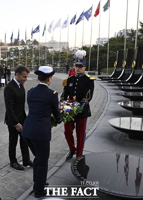에마뉘엘 마크롱 프랑스 대통령이 2일 오후 서울 용산구 전쟁기념관을 방문해 프랑스 유엔군 참전비를 찾았다.