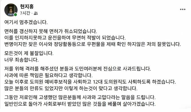 현 의원은 이날 자신의 페이스북에 "면허를 갱신하지 못해 면허가 취소됐고, 이를 인지하지 못하고 운전하다가 무면허로 적발됐다"고 밝혔다.