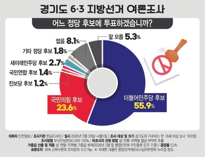 2일 인천일보가 한길리서치에 의뢰해 지난 3월 30일부터 4월 1일까지 3일간 경기도 거주 만 18세 이상 유권자 1003명을 대상으로 실시한 경기도지사 후보 지지도 조사(오차범위 ±3.1%p) 결과 "이번 경기도지사 선거에서 어느 정당 후보에게 투표하겠느냐"는 질문에 민주당 후보 55.9%, 국힘 후보 23.6%로 집계됐다. 격차는 32.3%p에 달한다.