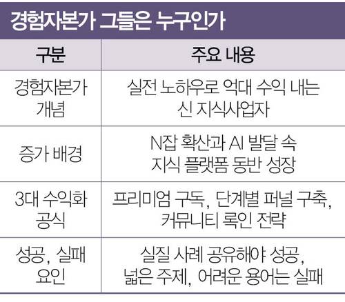 취재 결과 성공하는 경험자본가에게는 세 가지 특징이 있었다. 대기업이나 대형 조직에서 검증된 이력을 바탕으로 문제의 본질을 구조화하는 데 능숙한 사람, 현업 실무 고민을 구체적으로 풀어주며 당장 출근해 써먹을 지식을 전달하는 전문가가 주목받았다. 또 화려한 말솜씨보다 빈틈없는 데이터와 실제 실패 사례를 아낌없이 내놓을 때 높은 수입으로 이어졌다.