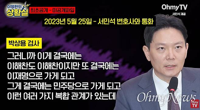 | ▲ 쌍방울 대북송금 사건을 맡은 박상용 검사가 이화영 전 경기도 평화부지사를 수사하면서, 고 이해찬 전 국무총리와 이재명 대통령을 언급하며 이 전 부지사 변호인이던 서민석 변호사에게 "솔루션을 제시해달라"고 요청한 녹취를 <오마이뉴스>가 확보했다. 지금까지 공개되지 않은 새로운 통화 음성파일이다. |