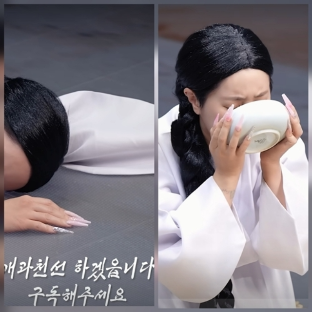 두 번째 영상에서는 강한 퍼포먼스로 시선을 잡았다. 소복 차림에 땋은 머리를 한 채 등장한 그는 바닥에 무릎을 꿇고 큰절을 올렸다. 이어 사약을 연상시키는 음료를 한 번에 들이키고 그대로 쓰러지는 연출까지 더하며 “개과천선 하겠습니다. 구독해주세요”라는 자막으로 웃음을 유도했다.