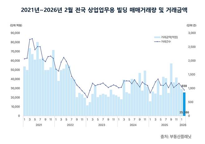 올해 2월 전국 상업업무용 빌딩 매매시장은 거래량이 2025년 1월(834건) 이후 1년여 만에 다시 1000건 아래로 내려앉으며 위축된 흐름을 보였다. 거래금액 역시 3개월 연속 하락세를 이어간 가운데, 비교적 고가 자산을 중심으로 서울 쏠림 현상이 두드러졌다.
