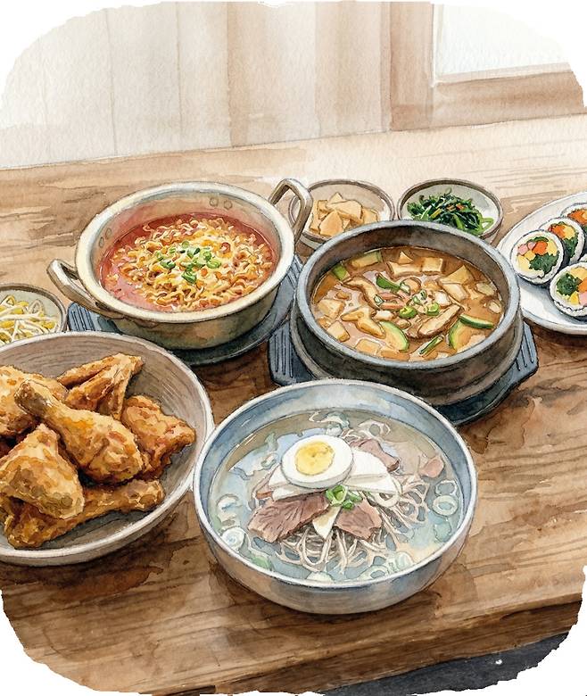 라면과 김밥도 빼놓으면 섭섭하다. 라면은 제2차 세계대전 직후 대만계 일본인 안도 모모후쿠가 거듭된 실패를 딛고 개발해 1958년 출시했다. 원래 순한 닭고기 국물이었지만 1963년 국내에서 최초로 생산되면서 얼큰한 소고기 국물로 변신했다. 우리 입맛에 더 잘 맞는다는 이유였는데, 덕분에 일본의 라멘과는 다른 음식으로 오랫동안 사랑받고 있다. 김밥 또한 일본의 마키가 원형이지만 결이 사뭇 다른 속재료를 채워 대표적인 한식 메뉴가 됐다. 그리고 2023년 8월, 미국 슈퍼마켓 체인 ‘트레이더 조스’에 진출해 K의 기치를 높이고 있다.
