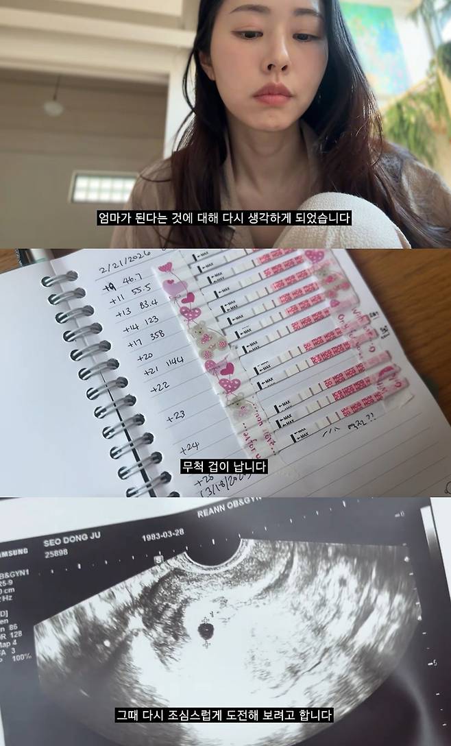 이어 "피검사 수치가 더디게 오르다가 아기집이 생겼고, 난황까지 확인하며 희망을 가졌다"며 "하지만 병원에서 아기집의 성장이 멈춘 것을 확인했다"고 밝혀 안타까움을 더했다.