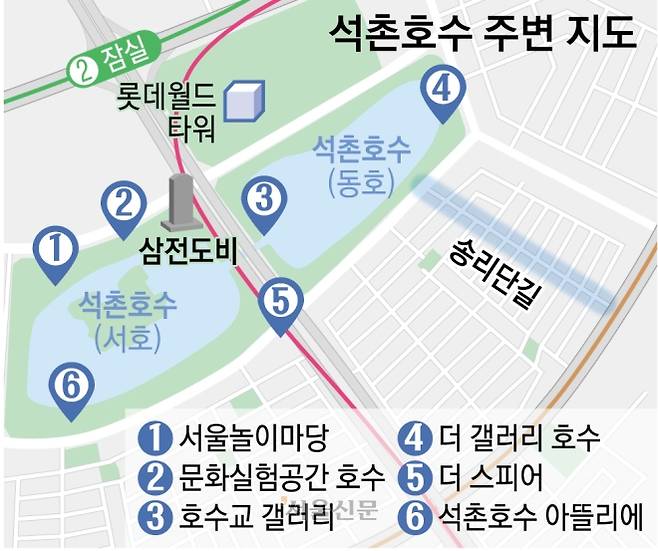 석촌호수는 1978년 완공 이후에도 오랫동안 난간을 두고 멀리서 봐야 하는 호수였다. 밤이면 석촌호수 북측의 서쪽 끝에서 동쪽 끝까지 포장마차 행렬이 늘어섰다. 1989년 서호 북측에 롯데월드 어드벤처, 이듬해 서호 가운데에 매직아일랜드가 문을 열면서 이 일대는 전환점을 맞았다. 방문객과 유동 인구가 급증하자 송파구도 석촌호수를 달리 보기 시작했다.