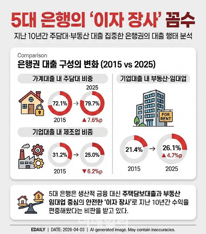 기업대출도 2015년에는 제조업 대출 비율이 31.2%로 업종 중 최대였지만 2025년 25.0%로 6.2%포인트 감소했고, 그 자리를 부동산 및 임대업(21.4%→26.1%)이 차지했다. 이 기간 제조업 대출은 61.2%(79조 6580억원) 증가에 그쳤지만, 부동산 및 임대업 대출은 144.7%(129조 3032억원) 급증했다. 결과적으로 주담대와 부동산 및 임대업 대출을 통해 은행들이 안전한 이자 장사로 참호 구축을 해왔다는 방증인 것이다.