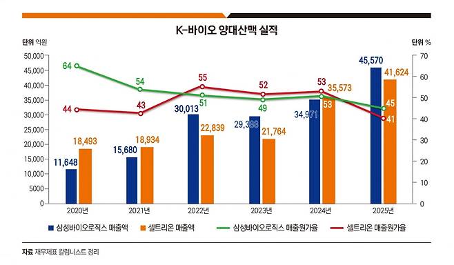 2025년 결산은 한국 바이오산업이 분기점을 통과했다는 걸 느낄 수 있다. 삼성바이오로직스와 셀트리온은 나란히 4조원의 매출액을 돌파했으며 단순한 외형 성장이 아니라 매출원가율을 40%대로 낮추었다. 바이오산업이 앞으로 제조와 효율, ‘고수익의 산업이 될 수 있다’는 신호탄을 쏘았다.