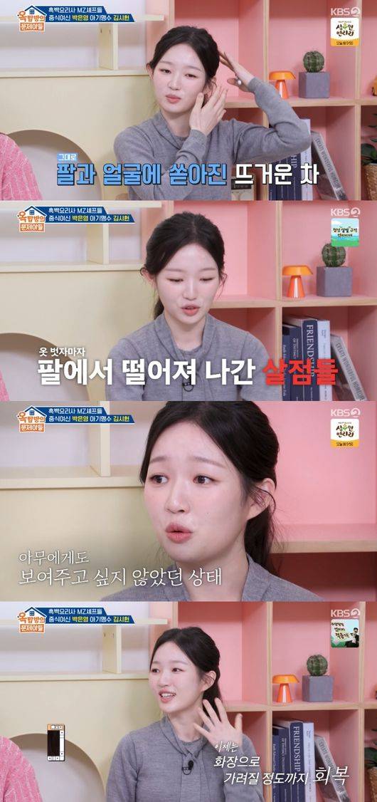 김시현은 “뜨거운 물을 식사 중에 차를 드시는데 끓이고 나르는 과정에서 바닥이 미끄러워서 쭉 넘어졌다. 제가 계단 밑으로 추락했다. 그래서 팔에 붓고 얼굴이랑 번졌다”라고 회상했다.
