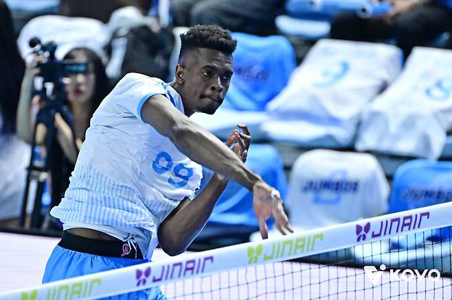 지난달 19일 카일 러셀의 대체 외국인 선수로 대한항공에 합류한 마쏘는 이날 18득점 공격성공률 71.43%을 기록하며 맹활약했다. 신장 2m 4cm에서 나오는 높이가 인상적이었다.