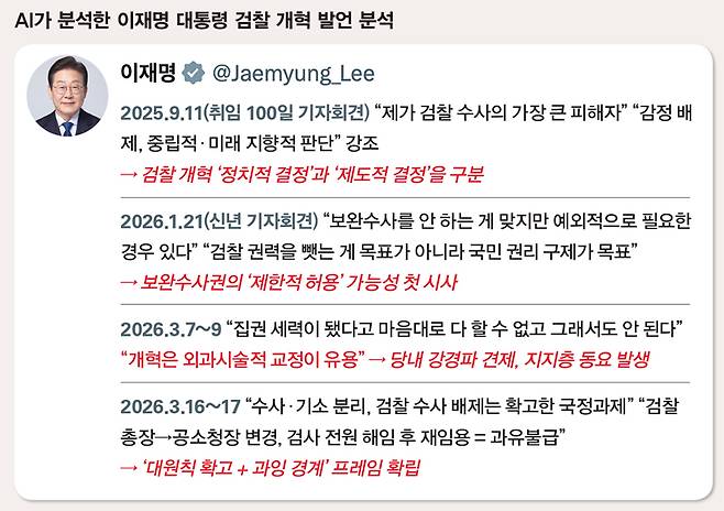사실 검찰 개혁에 대한 이 대통령의 입장은 시중에 공개됐다고 해도 무방하다. 지난해 9월 취임 100일 기자회견에서 이 대통령은 "제가 검찰 수사의 가장 큰 피해자"라면서도 "감정을 배제하고 중립적·미래 지향적으로 판단해야 한다"고 강조했다. 이듬해 1월 신년 기자회견에서는 "검찰 개혁은 권력을 뺏는 게 목표가 아니라 국민 권리 구제가 목표"라며 "보완수사를 안 하는 게 맞지만 예외적으로 필요한 경우가 있다"고 밝혔다. 이른바 보완수사권의 예외적 허용 가능성을 처음 언급한 날이다.