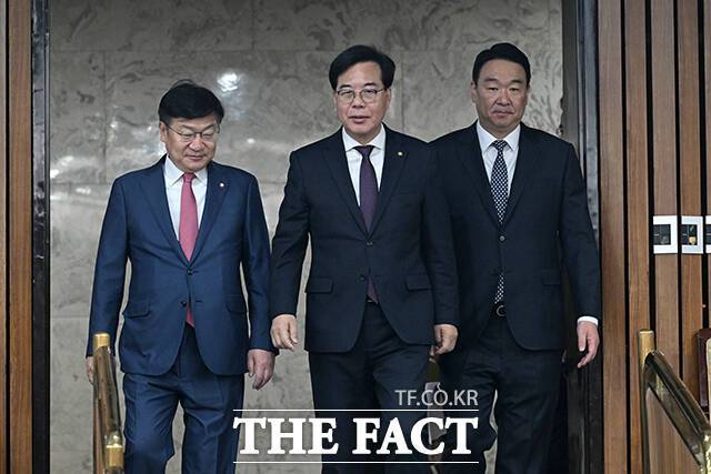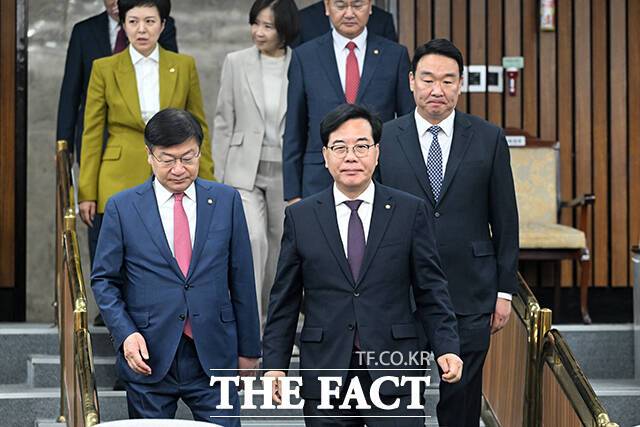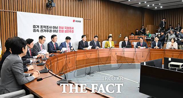 [더팩트ㅣ국회=서예원 기자] 송언석 국민의힘 원내대표(가운데)가 3일 오전 서울 여의도 국회에서 열린 국민의힘 원내대책회의에서 모두 발언을 하고 있다.