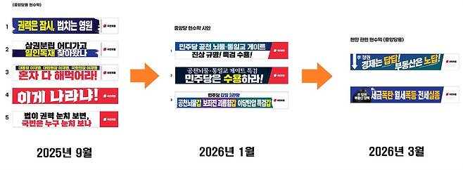 | ▲ 현수막이 올해 들어서 달라졌다. 1월의 '통일교 게이트 특검 현수막', 3월의 '사법파괴 3법 현수막'에서 빨간색은 국민의힘 글자가 적힌 구석으로 밀려났다. 가장 최근인 3월 26일 공개한 '부동산 정책 현수막'에는 아예 현수막 전체의 극히 일부분인 국민의힘 로고를 제외하면 빨간색이 보이지 않는다. |