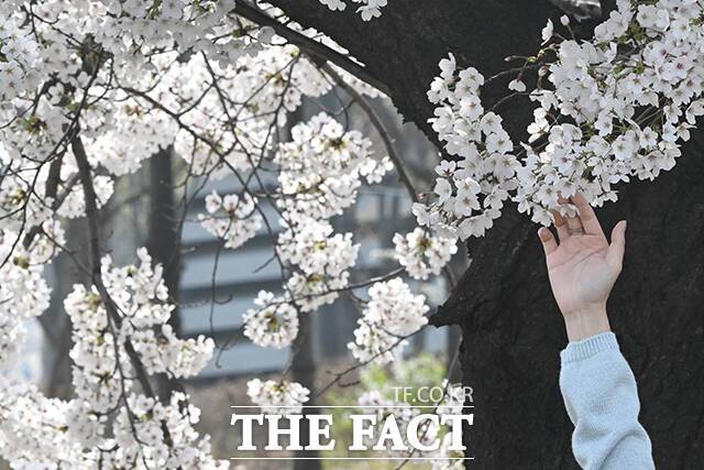 완연한 봄 날씨를 보인 3일 오전 서울 마포구 마포새빛문화숲을 찾은 외국인 관광객들이 벚꽃 아래에서 기념촬영을 하고 있다.