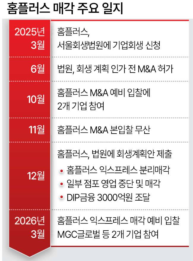 3일 IB업계에 따르면, 홈플러스 측은 구체적인 원매자와 조건을 공개하지 않았지만, 시장에는 지난달 31일 마감된 홈플러스 익스프레스 예비입찰에 MGC글로벌이 인수의향서(LOI)를 제출한 것으로 알려졌다. 이를 포함, 2개 기업이 참여했다. 롯데, GS리테일 등 기존 유통 대기업과 주요 이커머스 업체들은 이번 예비입찰에 참여하지 않은 것으로 전해졌다.