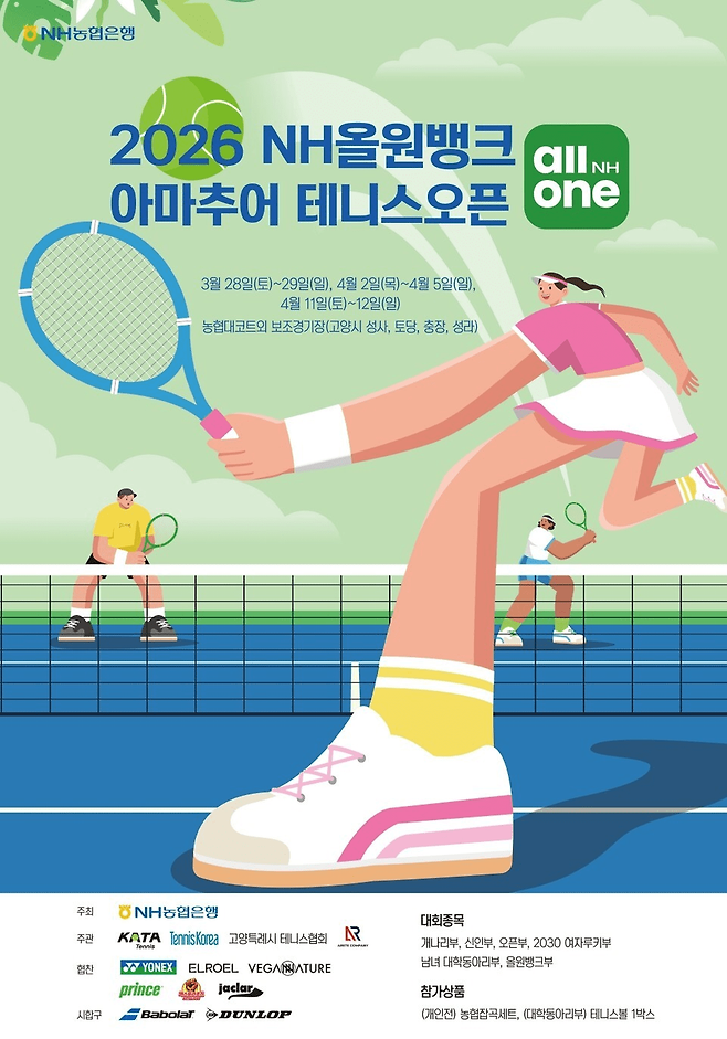 NH농협은행(은행장 강태영)이 마련한 2026 NH올원뱅크 아마추어 테니스오픈은 바로 그 지점을 정확히 파고드는 대회입니다. 기록 경쟁에만 머무르지 않고, 다양한 세대와 계층이 라켓 하나로 연결되는 장을 만들겠다는 의지가 또렷하게 읽힙니다. 대회는 3월 28~29일, 4월 2~5일, 4월 11~12일에 걸쳐 경기 고양시 일대와 농협대학교 테니스장에서 열립니다. 우천에 대비해 4월 18~19일을 예비일로 잡을 만큼 운영도 꼼꼼합니다.