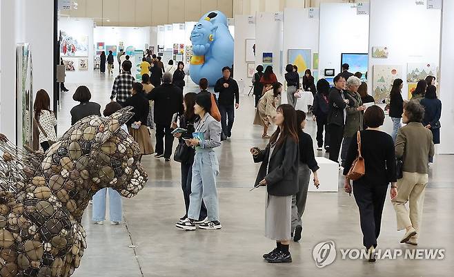 (부산=연합뉴스) 강선배 기자 = 3일 부산 해운대구 벡스코 제1전시장에서 열리고 있는 제15회 2026 부산국제화랑아트페어(BAMA)에서 관람객들이 작품을 살펴보고 있다.