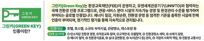 그린키는 환경교육재단(FEE)이 운영하는 국제 인증으로, 에너지 관리와 자원 사용, 운영 방식 전반을 포함한 13개 항목을 통과해야 합니다. 현재 90개국, 8,000여 개 시설이 참여하고 있습니다.