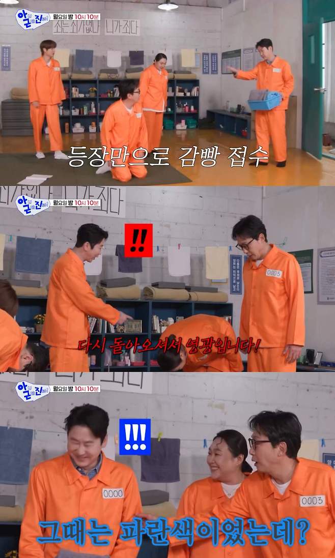 이수지는 "(죄수)번호도 0000이다. 이건 진짜 경험 있는 자에게만 주는 거다. 이게 우대해주는 거다"라며 신동엽을 계속 놀렸고, 신동엽은 "변한 게 있나 둘러봐라"라는 말에 세트장을 둘러봐 시선을 사로잡았다.