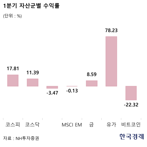 3일 NH투자증권에 따르면 지난 1분기 코스피 수익률(TR 기준)은 17.81%로 집계됐다. 이 기간 코스피지수가 19% 가까이 오르면서 높은 수익률이 나타났다. 코스닥 수익률은 11.39%였다.