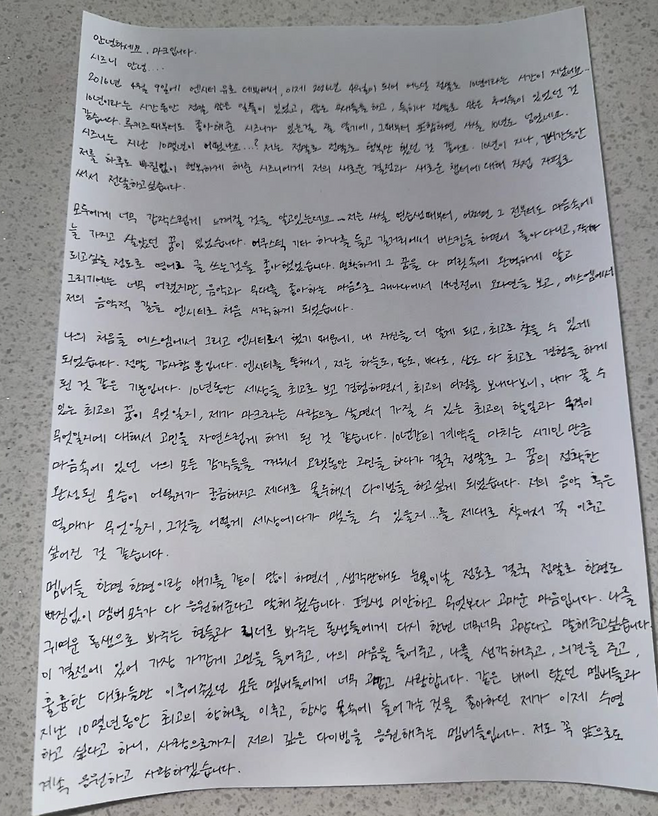 마크는 이날 인스타그램에 자필로 심경을 전하기도 했다. 그는 "지난 10년이라는 시간 동안 정말 많은 일이 있었고, 많은 무대를 했고 많은 추억들이 있었다"고 떠올렸다.