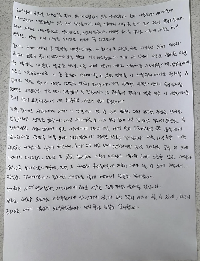 마지막으로 "저를 10년 동안 가장 행복한 사람으로 살게 해줘서, 소심하게만 있던 가수라는 꿈을 더 크게 가지게 해줘서, 그 꿈을 이루게 해줘서 감사드린다. SM, NCT, 시즈니에게 고마운 마음을 평생 가지고 살 것"이라고 덧붙였다.